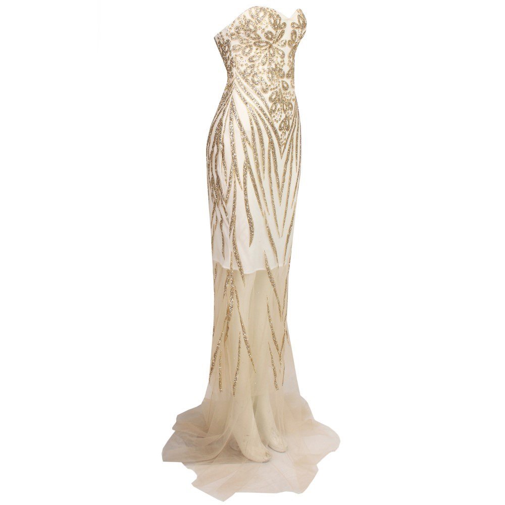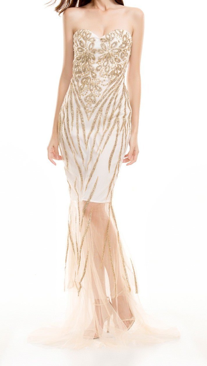 Strapless White Gold Sequin Maxi Mermaid Dress